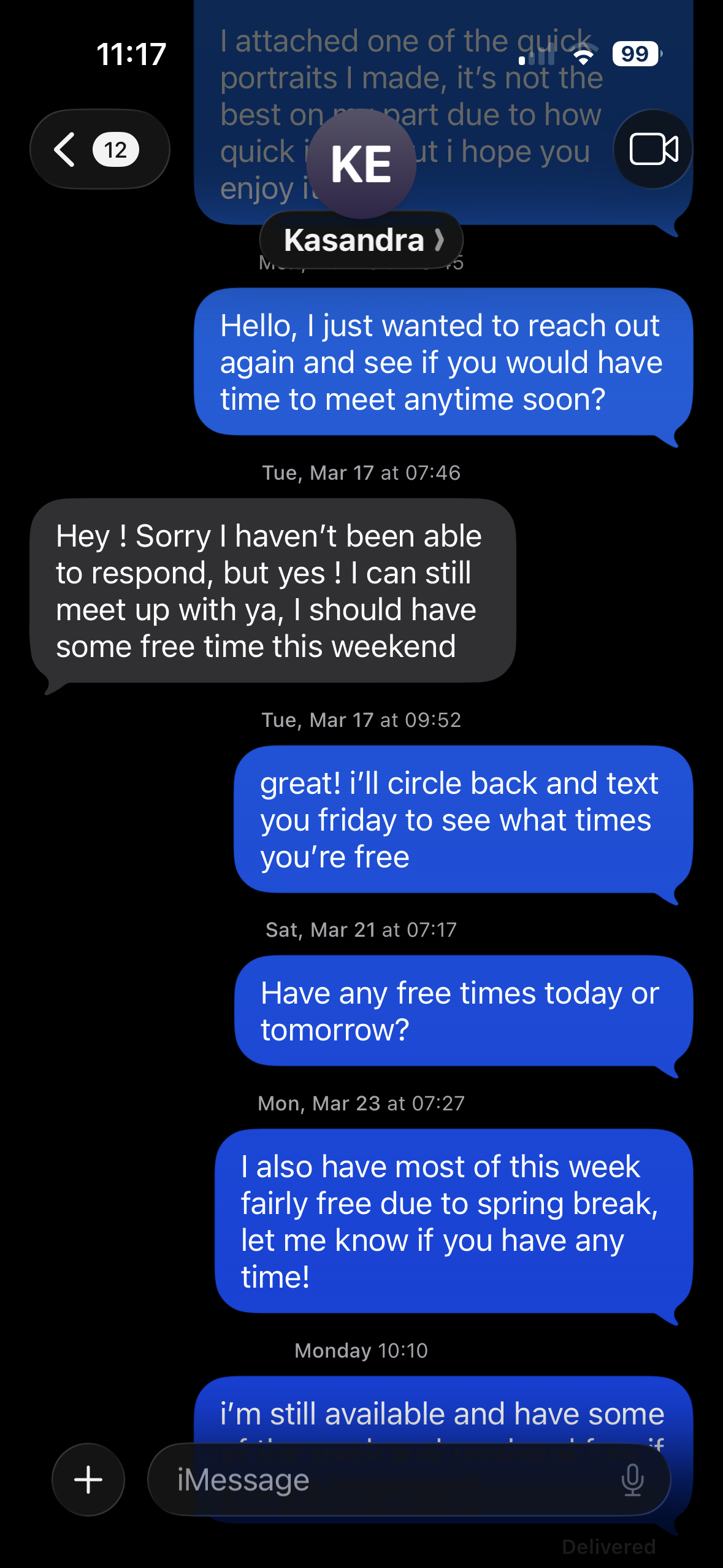 As of right now, it seems that Kasandra has completely ghosted me. I had sent her the photo and waited, then sent a follow up shortly after. She responded immediately with enthusiasm, but still never set up a time with me despite attempts in calls and texts. I don’t know the reason, but she was the most excited for this of any person I talked to, and hope to find someone that into the project that will also commit